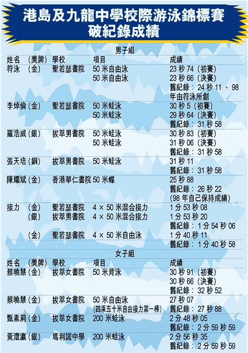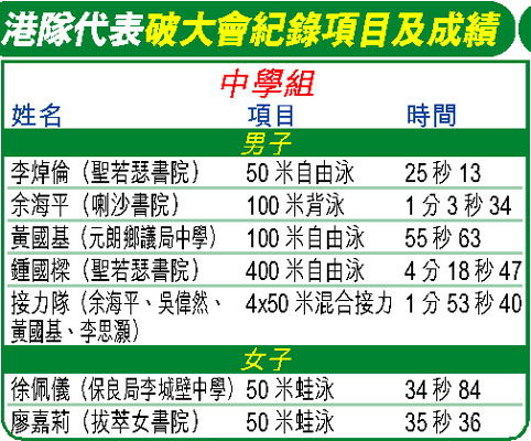 港隊共刷新七項大會紀錄,更包辦中學組男、女子四乘五十混合接力泳金牌。