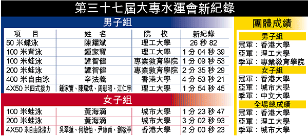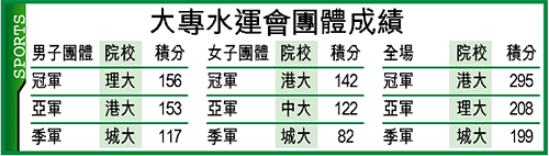 第三十七屆大專水運會在城市大學泳池舉行。港大囊括十一面金牌,