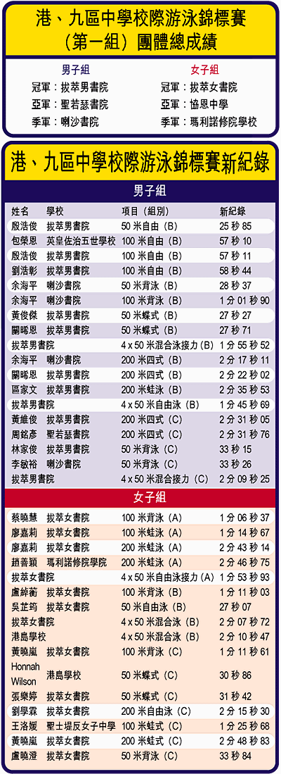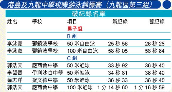 第一組校際泳賽中,刷五十米背泳、自由泳新紀錄,