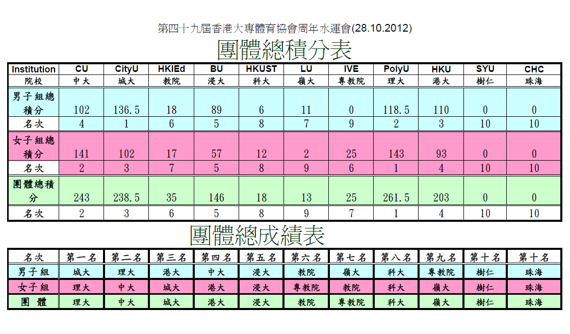 | 11/10/2012 | 團體成績 Overall | 19/10/2012 | 團體成績 Overall | |