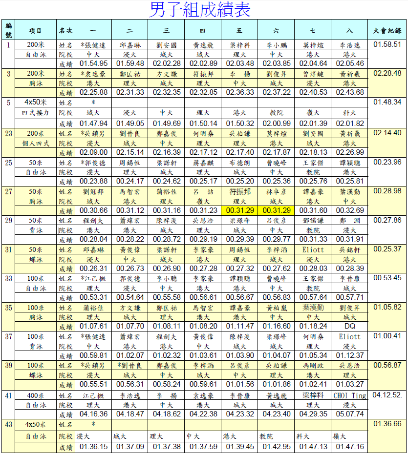 | 日期 | 泳手 | 項目 | 時間 | 總排名 |