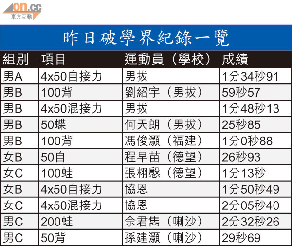 | 謝旻樹 | 男子100米自由泳 | 50秒48 (平香港紀錄) |