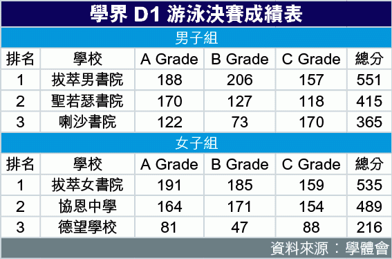| 男子團體總亞軍 | 泳天游泳會(WTS) 163分 |