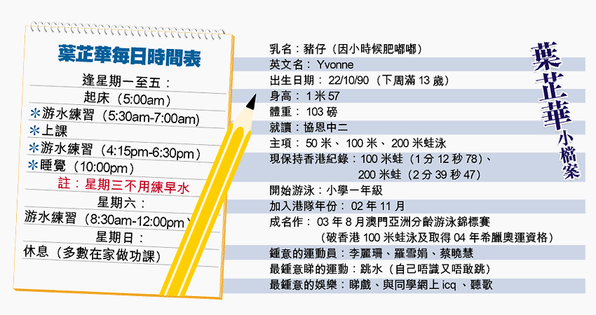 耐力強從不叫苦 對於一年半前在泳隊的表現技不如人,芷華說:「初時都有少少自卑,覺得基礎唔及別人,耐力又差少少,所以迫自己勤力些練習,好似我轉身後撐腳唔夠力,所以每次集訓完,我會留低繼續練多幾次,得閒又會在體育學院跑步練氣,或做器械操,例如做划艇和舉重等動作改善身形,希望由現時1米60增加至1米70的高度。」 為了參加集訓,芷華不惜犧牲大部分玩樂時間,在家連電視也沒時間看,長假可能也要到海外參加訓練營,有時葉媽媽擔心她要兼顧學業太吃力,苦勸她少練一兩次早水,但芷華不僅沒有「奉旨」偷懶,反而利用小息和午飯時間做功課,好讓晚上能夠早睡,翌日可在清晨5時起H趕去練習,父母對於小女兒的W心和堅持,既是欣賞也是痛心。 當然,芷華也有遇上誘惑的時候,她扁扁嘴說:「我好鍾意行街和唱卡拉OK,整個復活節假期我只行過兩次街,有時考完試同學去唱K,會同我講『唔好去練習啦,練少一次又唔會死!』,我都會心郁郁想去玩,但每次到最後都係揀去游水,因為唔去練水,我會有內疚感!」 我的偶像蔡曉慧 雖然,蛙式才是芷華的強項,但她崇拜的泳界偶像,卻是善長背泳及混合泳的蔡曉慧,她們二人同屬香港游泳隊,不過碰面機會甚少。芷華說:「因為受訓時間唔同,所以我只見過她兩次,她個人好nice,見面時都有鼓勵我畀心機練習,她是多項長短池的紀錄保持者,但係從來都唔會驕傲,仍然好勤力練習,我覺得這一點好值得學習。」