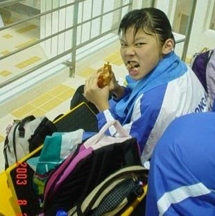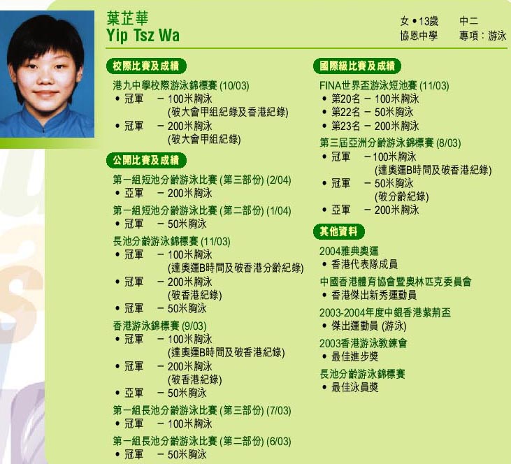 羅雪娟(19歲,今年7月在巴塞隆拿世界賽奪50米蛙、100米蛙及4x100米混合接力3項冠軍):「我鍾意她是每次見她在比賽都很愛笑,鍾意她給人好開心的感覺,我想學她一樣。還有,她跟我同一個項目。」 李麗珊(33歲,96年奧運滑浪風帆冠軍):葉芷華未真正見過「珊珊」,只曾一次在體院遠遠望見,她說:「鍾意她奮鬥心好強,又好叻。我想還要勤力訓練,希望有一天像她一樣拿奧運金牌。如果真是見到她,好想拿她的簽名。」 蔡曉慧(19歲,多項香港長池紀錄保持者):「我不是同她好熟,但聽人說她雖然是全港第一,但不驕傲,值得我們學習。」 如無看錯,葉芷華應該是一個開心、愛笑、奮鬥心強及不自負的一個人。如無意外,小妹妹將可以在明年的希臘奧運會中與上述三人碰頭。 勢膺港奧隊最年輕選手 正如葉爸爸所說,芷華的游泳歷史好短。兩個月前的八月二十五日,芷華第一次代表香港出外參加游泳賽,那是在澳門舉行的「亞洲分齡游泳錦標賽」,她在家人(包括父母及讀中六的姐姐)的見證下,打破香港一百米蛙泳紀錄,時間好到(一分十三秒一六)可以直入明年奧運游泳賽。如無意外,她應該是香港歷來年紀最細的奧運選手。 這還不特止,芷華在澳門後的一個星期,再在「香港游泳錦標賽」第二度刷新一百米蛙泳港績(一分十三秒一三)及第一次破二百米蛙泳的香港紀錄(兩分三十九秒四七)。 在昨日的學界泳賽,這位小蛙后又再破一百蛙紀錄,時間推展至一分十二秒七八。 後記 問下周十三歲生日的芷華,想要甚麼生日禮物。小妮子想了大半天,答案是:「無乜喎!」原來父母早在上月,當芷華一口氣破了一百米蛙及二百米蛙泳港績時,已提早送了一個新手提電話及MP3作為生日禮物。問她生日那天會不會不想游水?她立刻反應說:「會謘A不過想還想,我知那天還是要練水。」 <<圖文轉載自蘋果日報>> |