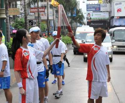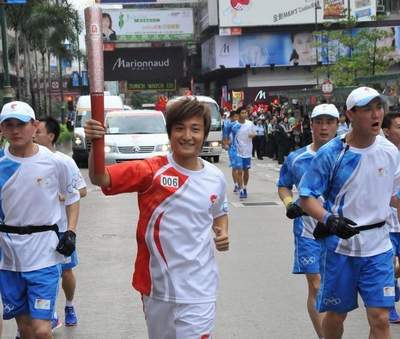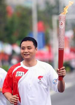 5月28日北京奧運會聖火在安徽合肥傳遞,火炬手 - 前亞洲蛙王陳劍虹手持火炬,得意洋洋。 |