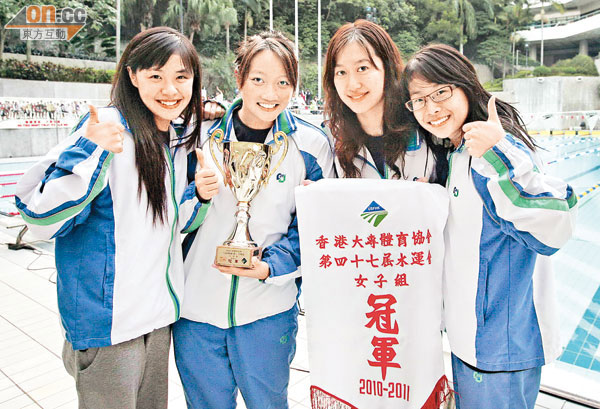 城大創歷史成總冠軍!昨日舉行的大專水運會,擁有主場之利的城大成為大贏家。除於男子組摘下季軍外,女子隊亦以一分之微壓過中大首次封后,因而力壓理大和港大,史無前例於大專水運會成為團體總冠軍,令城大的名字第一次留在總冠軍獎盃上。 城大一眾健兒贏得總冠軍後齊齊影威水相。 險勝中大1分 近三年都於男、女子組稱霸的港大,今屆有陳宇寧、陳浩深等主力離隊,令團體總冠軍的爭奪出現變數。其中女子組方面的戰況尤為激烈,中大和城大要鬥到最後才可分出勝負。城大於4×50米自由泳接力前,只領先中大7分,要力保這個女子組冠軍,必須要游入前三,幸一眾女將都表現有水準,力保第三,終以1分壓倒中大摘冠,再加上男子組的季軍,令城大首奪大專水運會水霸王! 城大男、女子隊隊長譚德政和湯嘉瑋表示,陣中沒有星級泳手,不過勝在夠平均,亦是今屆的致勝關鍵:「我們個人項目未必能成為第一,但很多時大家都可以入到決賽,這樣在分數上計落反而不會輸蝕。」 湯嘉瑋表示女子隊目標是坐亞望冠,最後可以一舉奪得團體總冠軍實是喜出望外:「去到臨頒獎前一刻才知道奪總冠軍,好開心,我今年畢業,希望大家明年繼續努力。」於50米、100米蛙泳都奪金而回的她,特別多謝兩位教練魏開義和林德明的教導,全靠他們泳隊才有如此成績。 東方日報 2010-11-01