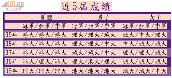 | 季軍 | 港大(209) | 城大(103) | 港大(86) |