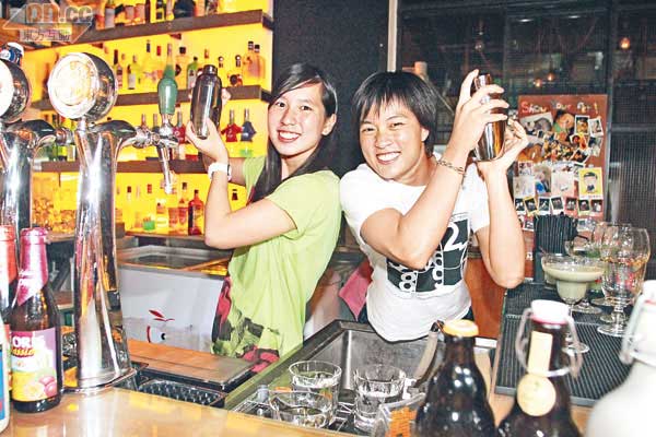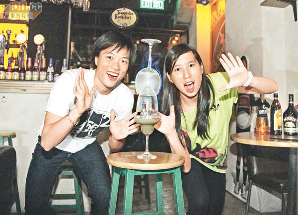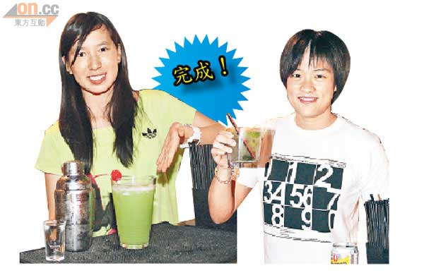 劉彥恩施幸余拜師學調酒 大熱天時,游泳雖可消暑,但飲杯凍飲就更透心涼!青春泳將施幸余(「施魚」)和劉彥恩(Claudia),決定搞搞新意思,在今期《齊齊玩過界》中,攜手「拜師」學調酒。兩位乖乖女平時甚少沾酒,所以「師傅」Walter為二人重新制訂了不加酒或少酒精特飲的「過三關」挑戰。今次「玩酒」唔「玩水」,究竟師姐醒,還是師妹勁? 兩條飛魚今次「游」入位於銅鑼灣耀華街、由一班本港欖球健將所開的「Ruggers」學藝,莫說調酒,連落Pub都是第一次,所以有13年年資的酒吧經理兼調酒師Walter,為「徒弟」設計簡易的「過三關」挑戰。 施魚強勁臂彎舂薄荷葉 「Mojito」大家飲得多,首先闖關的「施魚」今次就試試調校難度屬「兩粒星」、無酒精的「Virgin Mojito」。見慣大場面的泳壇師姐笑笑口上場,似乎毫不緊張。有Walter的指示,倒、量、拌等基本動作絕無難度,最有挑戰性的,就是刨冰和「舂」薄荷葉!幸好「施魚」訓練有素,練出強勁臂彎,在兩聲「嘩」及連串大笑中,任務有驚無險完成,向來冷靜的她也忍不住大叫「Yeah」!