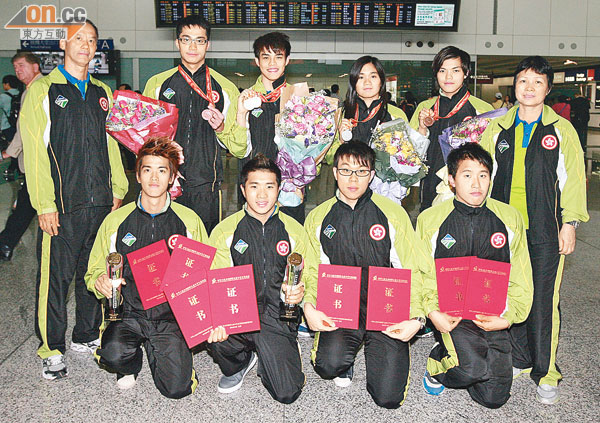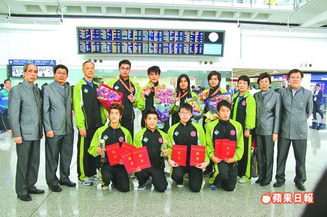 港全大運代表團凱旋 【本報訊】第九屆全國大學生運動會於前天在天津圓滿結束,香港大專體育會在本屆賽事共派出71 名運動員,最後合共奪得1 銀5 銅,是回歸後參賽以來成績最好的一次。 奪1 銀5 銅 本屆賽事港團的獲獎名單如下,銀牌得主張詠芝(女子甲組50 米背泳);5 面銅牌得主分別是鄭嘉俊(男子甲組200 米蝶泳)、邱嘉琳(男子甲組100 米蝶泳)、江己概(男子甲組100 米、200 米自由泳)。 大公報 2012-09-20 大學精英凱旋榮歸 全國大學生運動會於天津圓滿結束,港隊今屆共取1銀5銅的佳績,其中奪1銀4銅的泳隊昨日聯同田徑、跆拳道和男子足球等代表凱旋歸來,一眾得獎健兒期望向世界大學生運動會進發。 就讀理大酒店系的江己概取得兩面自由泳銅牌,是他首次於大型運動會得獎,表示這是對自己的一個肯定:「很高興可以取得獎牌,未來希望可以出戰世大,也望於今年底的亞洲賽爭佳績。」至於城大會計系副學士的張詠芝就於女子甲組50米背泳摘銀,是港隊今屆唯一一面銀牌,她稱日後仍會訓練和參賽,但不會轉全職,因要專注學業。 東方日報 2012-09-20 江己概奪全大運第二銅 港隊「飛魚」江己概周日出戰全國大學生運動會,於男子甲組200米自由泳游出1分55秒71,勇奪個人今屆第二銅,金、銀牌則由浙江的宋尊榮及天津的付永軍奪得。港隊現累積一銀五銅。 星島日報 2012-09-18 港泳手江已概全大運再得銅 香港泳手江己概,前日在天津全國大學生運動會,男子甲組200米自由泳以1分55秒71成績,為香港增添1面銅牌。他個人至今已累積2面銅牌。金牌及銀牌得主,則為浙江的宋尊榮及天津的付永軍 新報 2012-09-18 全大運 港泳手又摘銅牌 香港大學生泳手又在天津中國大學生運動會奪牌,男泳手江己概在甲組200米自由泳取得銅牌,港隊暫時累積1銀5銅,今日閉幕禮仍有游泳比賽。 蘋果日報 2012-09-18 港泳手江已概全大運再得銅 香港泳手江己概,前日在天津全國大學生運動會,男子甲組200米自由泳以1分55秒71成績,為香港增添1面銅牌。他個人至今已累積2面銅牌。金牌及銀牌得主,則為浙江的宋尊榮及天津的付永軍。 新報 2012-09-18 邱嘉琳全大運摘得銅牌 港隊昨於天津舉行的全國大學生運動會再傳捷報,泳將邱嘉琳於男子甲組100米蝶泳游出57秒20,屈居上海的胡以勇及東道主劉通之後摘銅。港隊現於今屆賽事累積一銀四銅。 星島日報 2012-09-17 全大運港泳手百米蝶摘銅 香港男選手邱嘉琳在中國全國大學生運動會,於男子甲組100米蝶泳項目,游出57秒20獲得一面銅牌,金牌為上海隊的胡以勇,銀牌為天津的劉通。目前,港隊是次比賽已獲得了1銀4銅。 東方日報 2012-09-17 邱嘉琳100米蝶奪 香港選手邱嘉琳昨於中國全國大學生運動會,男子甲組100米蝶泳項目,游出57秒20獲得銅牌。港隊至今已累積了1銀4銅。 太陽報 2012-09-17 港男奪全大運百米蝶銅牌 香港男泳手邱嘉琳(圖)昨在天津中國大學生運動會的游泳比賽,以57秒20取得男子甲組100米蝶泳銅牌,港隊暫於本賽累積1銀4銅。 蘋果日報 2012-09-17 為港增光 香港女泳手張詠芝(左)及男泳手江己概,前日在天津全國大學生運動會,分別在女子甲組50米背泳及男子甲組100米自由泳賽,取得銀牌及銅牌。 新報 2012-09-16 港兩泳將全大運添銀摘銅 香港泳手張詠芝昨在天津全國大學生運動會,女子甲組50米背泳賽,以31秒37成績取得銀牌,而男泳手江己概則在男子甲組100米自由泳賽,以52秒84成績摘下銅牌。 新報 2012-09-15 大運會港隊再摘1銀1銅 香港代表團於全國大學生運動會增添1銀1 銅。張詠芝於女子甲組50 米背泳游出31.37 秒,摘下銀牌,銅牌則為男子甲組100 米自由泳的江己概,其成績為52.84秒。港隊目前累積奪得1 銀3 銅。 明報 2012-09-15 全大運港泳手添銀銅 香港運動員昨在天津舉行的全國大學生運動會勇奪一銀一銅,泳手張詠芝贏得女子50米背泳銀牌,江己概在男子100米自由泳爭得銅牌。而倫奧銅牌得主李慧詩則在全國場地單車錦標賽山西太原賽事,贏得女子500米計時賽銀牌。 東方日報 2012-09-15 全大運 港泳隊添1銀1銅 昨在天津舉行的全國大學生運動會,港隊在游泳項目增添1銀1銅。張詠芝在女子50米背泳游出31秒37摘銀,江己概就在男子100米自由泳贏得銅牌,時間為52秒84。香港代表團至今共獲1銀3銅。 蘋果日報 2012-09-15 鄭嘉俊添銅 泳將鄭嘉俊(右二)前日於全國大學生運動會為港再添一面銅牌,他在男子200米蝶泳以2分09秒20排第三名,繼早前香港男子武術隊於該賽奪季軍後,又一位為港爭光的香港健兒。相片由大會提供 星島日報 2012-09-14 中大生鄭嘉俊200 蝶摘銅 港隊在全國大學生運動會再添一面銅牌,中文大學2 年級生鄭嘉俊在男子甲組200 米蝶游出2 分09.20 秒摘下銅牌,今屆港隊暫累積2 面獎牌打破歷屆紀錄。 未受舟車勞頓影響 19 歲的鄭嘉俊主項蝶泳,賽前一天才乘飛機抵達天津的他未受舟車勞頓影響,前日在200 米決賽游出接近個人最佳時間勇奪銅牌,他說: 「很高興,雖然距離PB(個人最佳時間)還約有0.5 秒,但場館距離酒店較遠,車程約1 小時,能保持狀態算是不錯。」鄭嘉俊昨日在男子甲組200 米混合泳預賽出局,未能晉身決賽,稍後他還將出戰100 米蝶及接力賽。 明報 2012-09-14 為港摘銅 香港男子游泳員鄭嘉俊,前日於天津全國大學生運動會男甲200米蝶泳決賽,以2分9秒20成積摘下銅牌。冠及亞軍為天津的姚遠及浙江的徐家暉。 新報 2012-09-14 體壇傳真︰港將摘銅 港隊繼日
