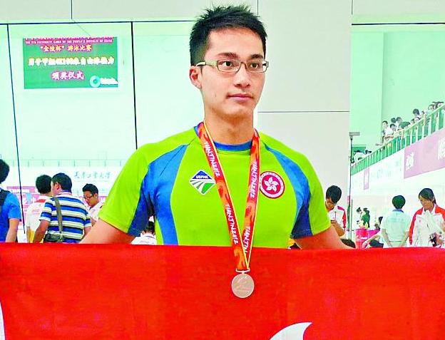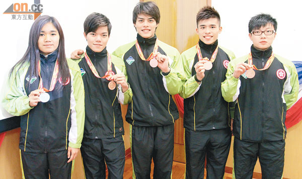 港隊全大運豐收昨慶功 香港代表團今年9月在天津的全國大學生運動會,取得一銀五銅佳績,昨日一眾獎牌得主出席在香港中文大學體育中心舉行的祝捷會。游泳代表張詠芝在女子甲組50米自由泳勇奪銀牌,江己概在男子甲組100米及200米自由泳掛銅,邱嘉琳和鄭嘉俊分別在100和200米蝶泳取得銅牌。武術「對練」代表李健暉在十字韌帶撕裂下仍與吳晉毅贏得銅牌。香港將派隊參加明年在俄羅斯喀山舉行的「第廿七屆世界大學生夏季運動會」。 五名大專運動員展示在全國大學生運動會所得的獎牌。 東方日報 2012-11-19