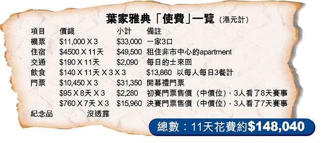 香港人在雅典睇奧運,得到三個字──「乜都貴」。由逾萬元的奧運開幕禮入場券揭開序幕,加上不便宜的食、住、行及機票,加起來貴得要命;這是葉芷華一家的親身經歷。不過能夠現場為愛女打氣,加上目睹不少奧運精采一刻,令金錢上的花費變得微不足道。 難得小女兒葉芷華取得雅典奧運一百米蛙泳的參賽資格,葉家三口──包括葉生葉太及大女兒葉芷寧,便與芷華一同在本月十二日到達雅典。為了打氣及令自己更加投入,葉生本想在雅典找一支香港區旗,但怎也找不荂F於是買了兩支中國旗「頂檔」,為女兒打氣、為港隊打氣,亦為中國隊打氣。 葉家所看過的奧運項目,有不少香港人也夢寐以求的,包括開幕禮、所有游泳初賽、羅雪娟奪奧運一百蛙泳金牌的決賽;費斯及科比在二百捷決賽的世紀之戰,只是代價不菲。 訪問時,葉家三口正在體操館,揮動茪什磥閂P旗,為中國體操隊打氣。雖然中國隊成績麻麻,但勝在差不多滿座的場館氣氛一流;這就是八十歐元一張入場券換來的「現場感」,葉太坦言「貴得有點不合理」。 在比賽中異常投入的葉生葉太,不時碰到緊張場面就大聲替中國加油,葉太說:「這堿し繷ㄥQ,入場券、食及住都貴,但很值得;因為現場看女兒出戰奧運是非常難得。我們看了多場游泳賽,還有羽毛球及體操,場內氣氛很好,之前亦無想過這樣好看;最重要是芷華在這個大賽中表現不錯,所以這一程是值得的。」不過葉太不忘補充:「不過,我們每一天簡單的一餐,都要每個人十多歐元,貴得實在厲害。」 昨日返回香港的葉家三口,今次雖然花了一筆不少的金錢,但換來畢生難忘的經歷,總算是貴得有道理吧! 蘋果日報(2004-08-24) |