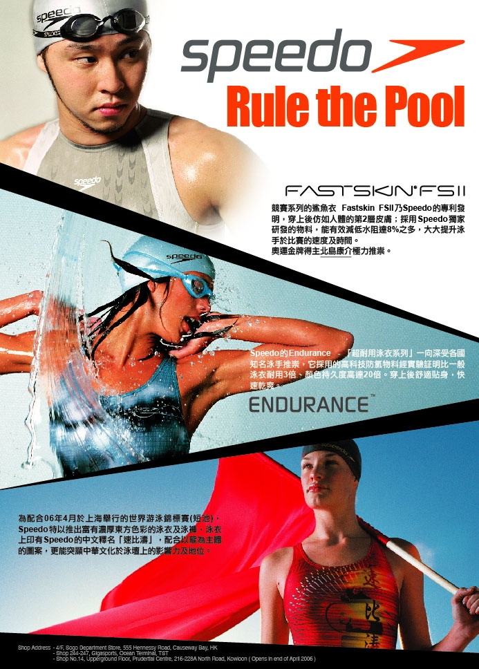 世界知名游泳用品品牌Speedo於1928年創立,目前為世界及香港No.1的游泳用品品牌。 於2004年推出的第二代鯊魚衣更協助多位泳手刷新新的世界紀錄; Speedo現今贊助的世界泳手包括美國的菲比斯、荷蘭的迪布恩及日本的北島康介。 06年Speedo的世界性宣傳主題為「Rule the Pool. Breach the Beach. Launch the Land」, 喻意「稱阞a壇無敵手,水陸用品冠全球」,不論於競賽或優閒系列,Speedo也不斷創新, 以優良的物料及科技研發最新的產品。 奧運金牌得主 – 北島康介 「Rule the Pool」分別有競賽及練水系列,當中以Speedo的Endurance系列為各國知名泳手推崇。 Endurance - 「超耐用泳衣系列」經實驗証明比一般泳衣耐用3倍、顏色持久度高達20倍。 而且它採用高科技的防氯物料,穿上後舒適貼身,快速乾爽。