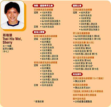 十四歲的蔡曉慧在該項賽事中不但取得女子一百米背泳銀牌,更締造四項香港紀錄,包括以一分四秒八四游畢一百米背泳及兩分二十一秒一八完成二百米背泳;二百米個人四式混合泳則創出兩分二十六秒零五的成績,而四乘二百米自由式接力賽則協助港隊締造出九分八秒八八的佳績。另外,更於四乘一百米四式接力中,泗出四分三十四秒九八香港青少年紀錄。 蔡曉慧對於兩奪這項殊榮,感到有點驚喜。她說:「當我知道這個消息後,起初真的不敢相信,因為從來沒有想過可以再次獲獎。我是第一個可以兩奪最佳青少年運動員殊榮的游泳運動員,所以感到很榮幸。」小妮子更多謝教練王大力的悉心教導,令她在短短時間內奠定游泳基礎,並且進步神速。 |